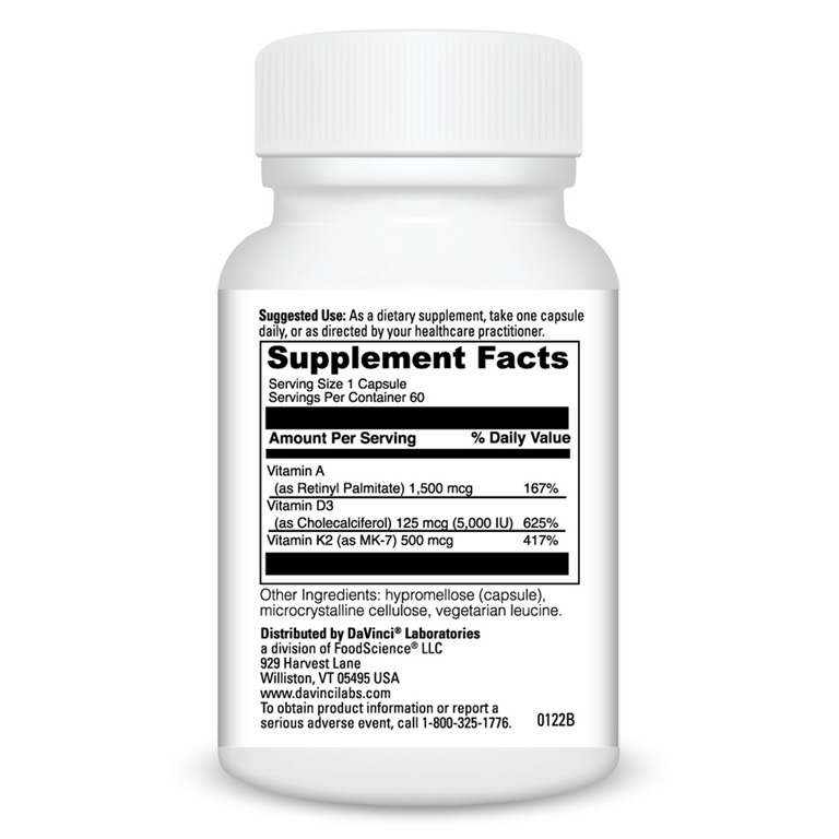Primary Function: A Dietary Supplement with Vitamins A, D3, and K2 (as MK-7). Adequate levels support bone health, immune function, and cardiovascular health.