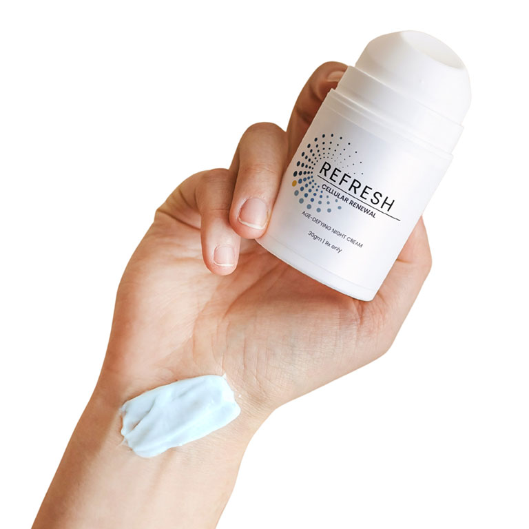 Refresh is a multi-action prescription night cream that promotes skin renewal and restores elasticity while you sleep. Its star ingredient, GHK-Cu copper peptide, is clinically proven to stimulate collagen, accelerate healing, and improve skin quality. Combined with prescription Tretinoin (a gold-standard retinoid for anti-aging), Refresh speeds up cellular turnover to smooth fine lines and fade imperfections. Estriol, a gentle form of estrogen, provides deep hydration and elasticity support—making this formula especially beneficial for aging or hormonally shifting skin.